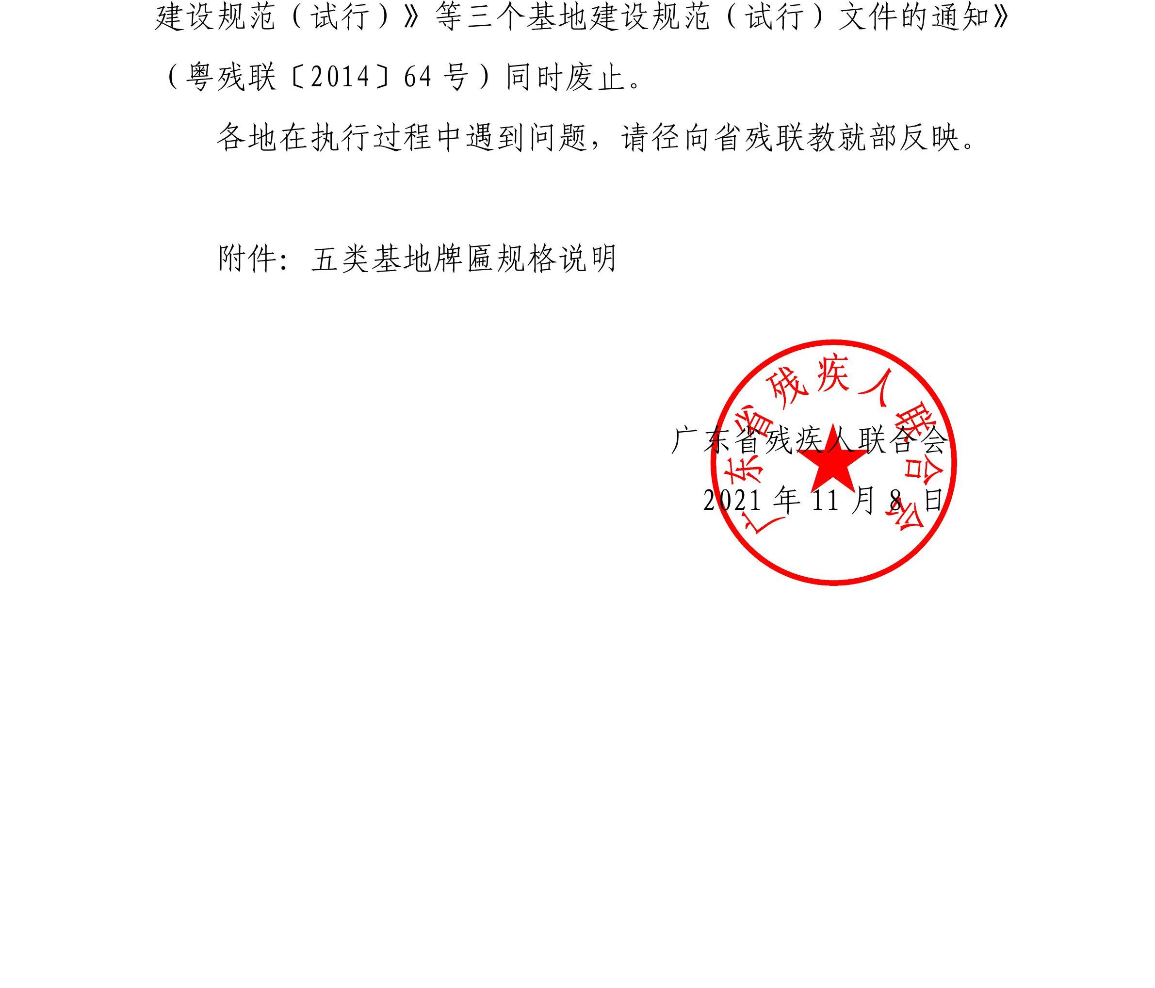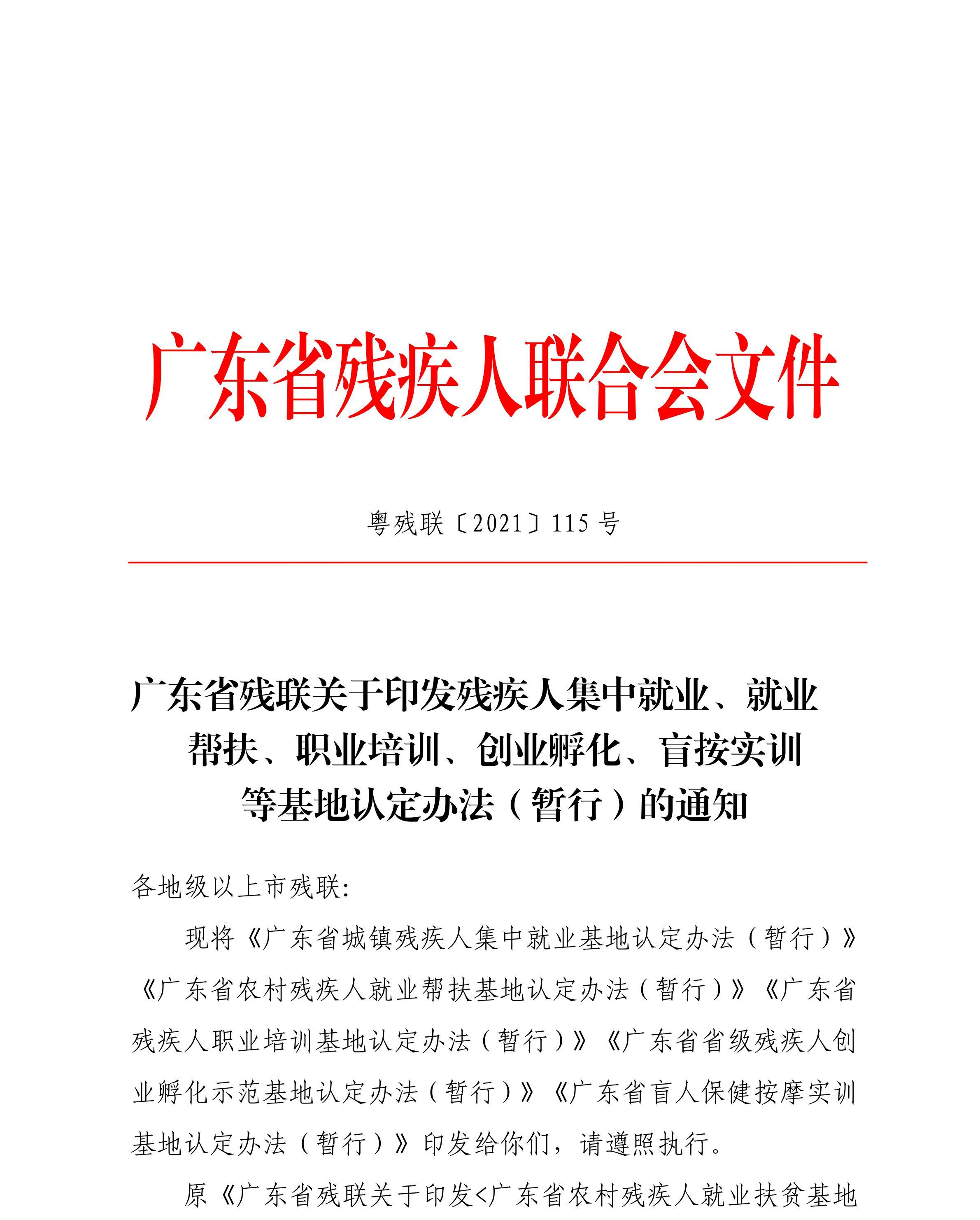 广东省残联关于印发残疾人集中就业、就业帮扶、职业培训、创业孵化、盲按实训等基地认定办法(暂行)的通知(粤残联〔2021〕115号).pdf